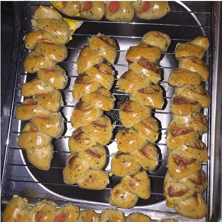 (4) 在面团表面撒些手粉以免粘手,把面团擀成长方形,把光滑面朝下放上培根,撒上辣椒粉。将面团卷起,收口捏紧,呈棒装。将完成好的面团收口朝下,保持适当距离,放在烤盘上。 用剪刀在面团上保持适当间隔剪成麦穗状,将剪好的面团交叉摆放。