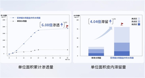 敷尔佳从源头重新设计成分,通过超分子技术改性得到超分子水杨酸苦参碱盐,从根本上解决了传统水杨酸"水溶性差"的问题。数据显示,相比传统单体水杨酸,这款原料的渗透量提升6.08倍,皮内滞留量提升4.04倍,炎症因子下调也更显著,还能抑制活性氧ROS生成,清除更多自由基,抵御肌肤氧化损伤。也就是说,不仅能更好地渗透到皮肤,还更温和,不像传统水杨酸那么刺激。