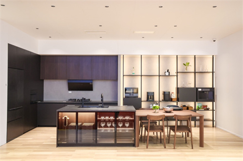 为四口之家打造的注重互动的厨房空间,不仅是烹饪场所,更是家人情感交流的中心。喜马拉雅系列橱柜与嵌入式厨电套系融为一体,搭配新一代I-Shelf实现整洁高效的空间利用率,结合中央岛台设计,将餐厨一体的动线合理规划。让孩子也能安全参与,成为全家互动中心,为全家增添互动乐趣。