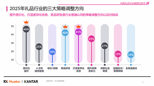 2025年中国礼品行业正处于从规模扩张向“高质量服务深耕”转型的关键阶段。行业信心指数回升至80分,市场结构呈现多元协同特征,民营企业仍是采购主力,采购决策者年轻化趋势显著(90后占比近半),推动需求向个性化、体验化演进。当前行业面临三大挑战:降本增效压力、合规风险上升、情绪价值凸显。企业普遍缩减福利预算,定制化需求增长推高成本,加剧价格竞争与利润挤压。在此背景下,质价比提升成为行业首要调整方向,46%的企业将其列为关键策略,反映竞争焦点从“低价”转向“优质优价”。数字化采购渗透率持续提升,近半企业加大投入,供应链数字化对行业产生积极影响占比达54%,效率革命与价值重构同步推进。
