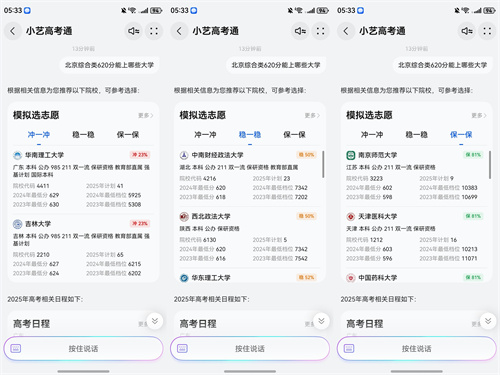 依托于昇腾云算力底座,全新的鸿蒙系统级智能体小艺融合了盘古大模型与DeepSeek双模型能力,基于全新小艺推出的小艺高考Agent能听懂并理解用户复杂意图,让用户更快速便捷掌握高考相关的服务和资讯。因此,当高考成绩公布后,考生或家长想要查询院校、分数线、志愿规划建议、模拟选志愿及相关专业等信息时,找到小艺高考Agent问一问就可以快速获得最新的高考资讯信息。比如在高考分数线公布后,打开小艺高考Agent问小艺:“北京综合类620分能上哪些大学”,小艺就会结合已有信息进行分析和整理,高效给出专业的答复。