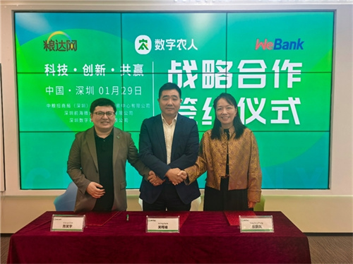 微众银行作为国内首家数字银行积极响应国家号召,在2025年3月与高灯科技旗下“数字农人”平台达成合作,为入驻平台的8000多户收购企业开设微众银行对公账户,实现了交易流程与金融服务的无缝融合。在此基础上,微众银行近日与中粮招商局(深圳)粮食电子交易中心有限公司(以下简称粮达网)、深圳数字农人科技有限公司在深圳正式签署三方战略合作协议,三方共同打造农粮产业链“交易 + 合规 + 资金”一体化解决方案,深度融合微众银行的数字金融能力、数字农人在农业数字化场景与合规服务方面的积淀,以及粮达网在大宗农粮交易中的平台优势,以数字金融服务乡村振兴,为“三农”企业数字化转型与高质量发展注入了新动力。